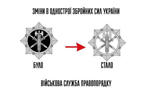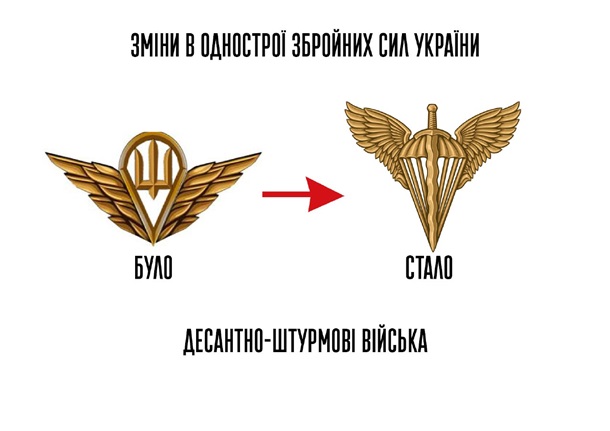 Зокрема, для Десантно-штурмових військ впроваджена емблема на комір, яка в мініатюрі повторює зображення беретного знака: окрилений парашут, на який накладено полум’яний меч. Змінено також емблеми Медичної служби та Служби ветеринарної медицини.
