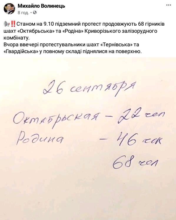 Станом на ранок 26 вересня під землею залишаюся 68 шахтарів. Зранку стало відомо, що шахтарі двох шахт — «Тернівська» та «Гвардійська», припинили забастовку та в повному складі піднялися на поверхню.